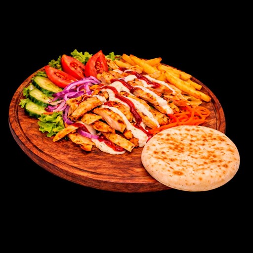 Донер на тарелке с курицей — сытное и яркое блюдо для настоящих любителей вкуса. Сочные стейки курицы, нарезанные аккуратными полосками, сочетаются с хрустящими свежими огурцами, спелыми помидорами, ароматной морковкой по-корейски и пикантным маринованным луком. Добавляется хрустящая картошка фри и поджаренные полоски лепёшки. Всё это щедро заправлено фирменным соусом и классическим кетчупом, создавая насыщенный, гармоничный и аппетитный вкус.