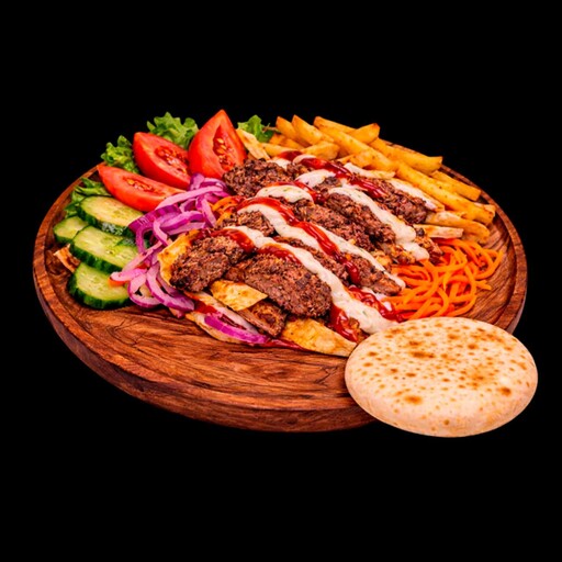 Донер на тарелке с говядиной — сытное и аппетитное блюдо с насыщенным вкусом. Сочные котлеты из говядины, разрезанные пополам, сочетаются со свежими огурцами, спелыми помидорами, ароматной морковкой по-корейски и пикантным маринованным луком. Добавляется хрустящая картошка фри и поджаренные полоски лепёшки. Всё это щедро заправлено фирменным соусом и классическим кетчупом, создавая гармоничный, сочный и насыщенный вкус