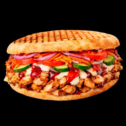 Донер с курицей — сытное и ароматное блюдо с нежным мясом. Сочная курица сочетается с маринованным луком, ароматной морковкой по-корейски, хрустящими огурцами и спелыми помидорами. Всё это аккуратно завернуто в мягкую лепёшку и дополнено фирменным соусом, классическим кетчупом и лёгкой ноткой барбекю, создавая гармоничный и насыщенный вкус
