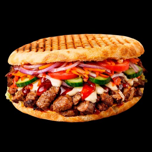 Донер с говядиной — сытное и насыщенное блюдо с сочной котлетой, аккуратно разделённой на части. Маринованный лук, ароматная морковка по-корейски, хрустящие огурцы и спелые помидоры создают свежесть и яркость вкуса. Всё это завернуто в мягкую лепёшку и дополнено фирменным соусом, классическим кетчупом и лёгкой ноткой барбекю, придавая донеру глубокий и аппетитный вкус.